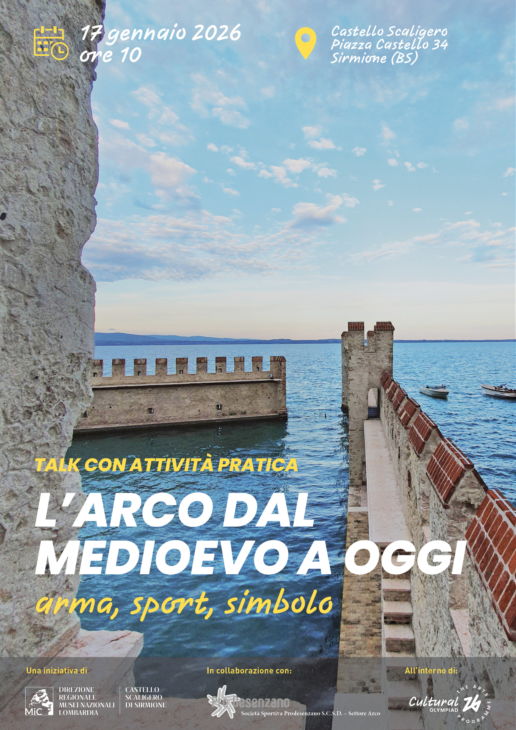 Il Castello Scaligero di Sirmione e la Società Sportiva Prodesenzano S.C.S.D. – Settore Arco collaborano per fare conoscere la loro storia, che ha un comune denominatore: la pratica del tiro con l’arco. Tra il XIII e il XIV secolo l’arco era l’arma più diffusa utilizzata nei combattimenti e nella difesa dei castelli. L’architettura del Castello di Sirmione lo documenta attraverso le numerose feritoie presenti nelle sue mura, che erano progettate proprio per consentire il lancio delle frecce verso il nemico pur consentendo all’arciere di mantenere una posizione protetta. L’iniziativa celebra il passaggio della fiaccola olimpica, creando un ponte tra storia, sport e valori universali, attraverso il racconto dell’evoluzione del tiro con l’arco: da arma medievale a disciplina olimpica moderna, accessibile e inclusiva.