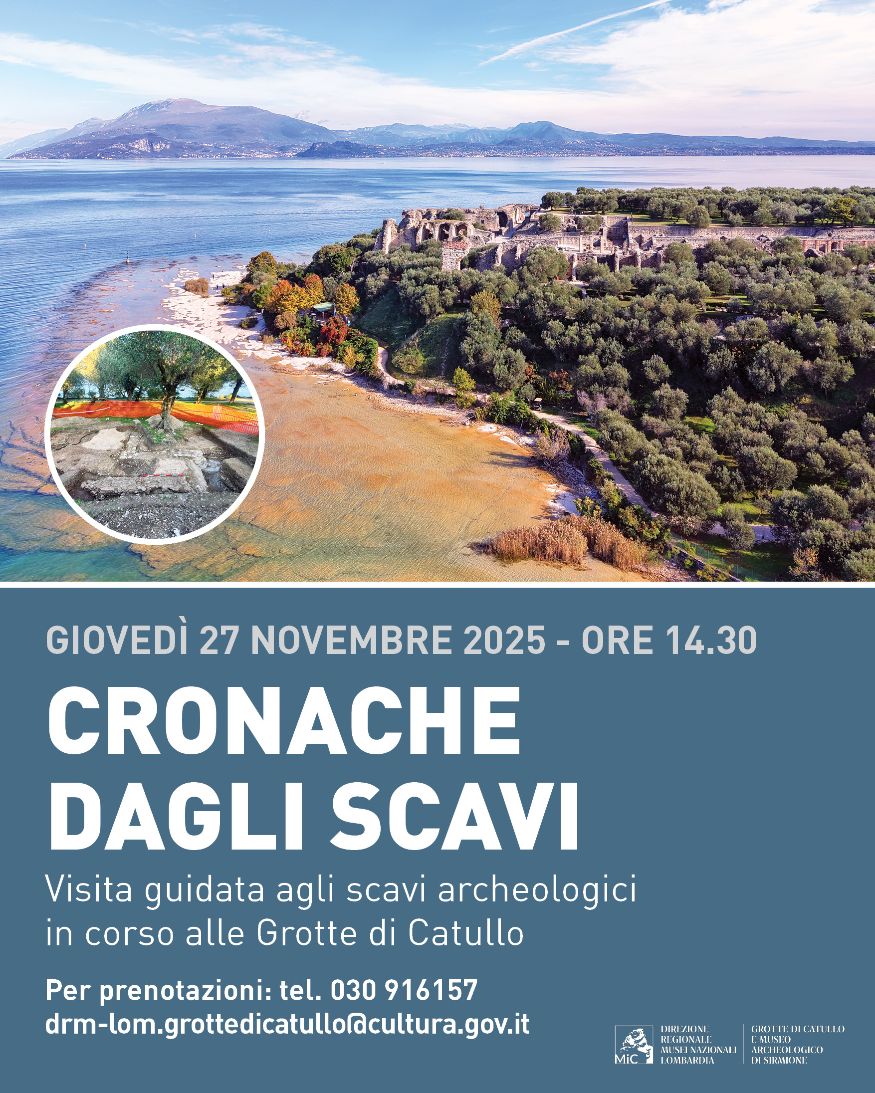 Giovedì 27 novembre alle ore 14.30 si terrà una visita guidata alle aree degli scavi archeologici in corso presso le Grotte di Catullo (Sirmione, BS). Durante il percorso verranno raccontate tutte le più recenti novità e le scoperte rilevate durante le attività di scavo e studio.