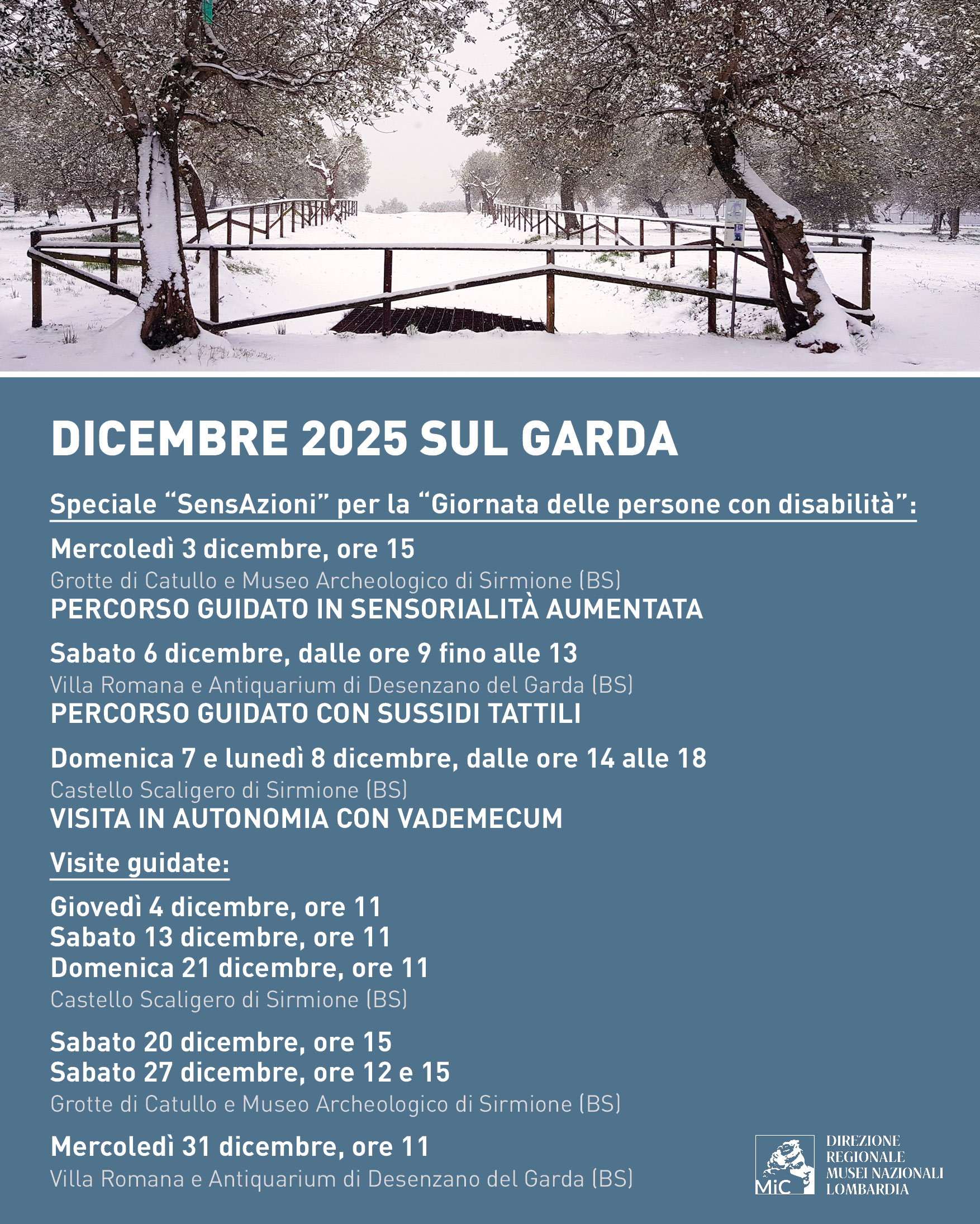 La Villa Romana di Desenzano propone invece, per sabato 6 dicembre una mattinata dedicata alla scoperta sensoriale del sito archeologico sempre con l’iniziativa “SensAzioni”. Dalle 9:00 alle 13:00 saranno disponibili visite guidate speciali, durante le quali i partecipanti potranno utilizzare i sussidi tattili messi a disposizione dal museo: strumenti pensati per favorire un’esperienza di visita più coinvolgente e accessibile, capace di far percepire da vicino i dettagli architettonici e decorativi della villa.