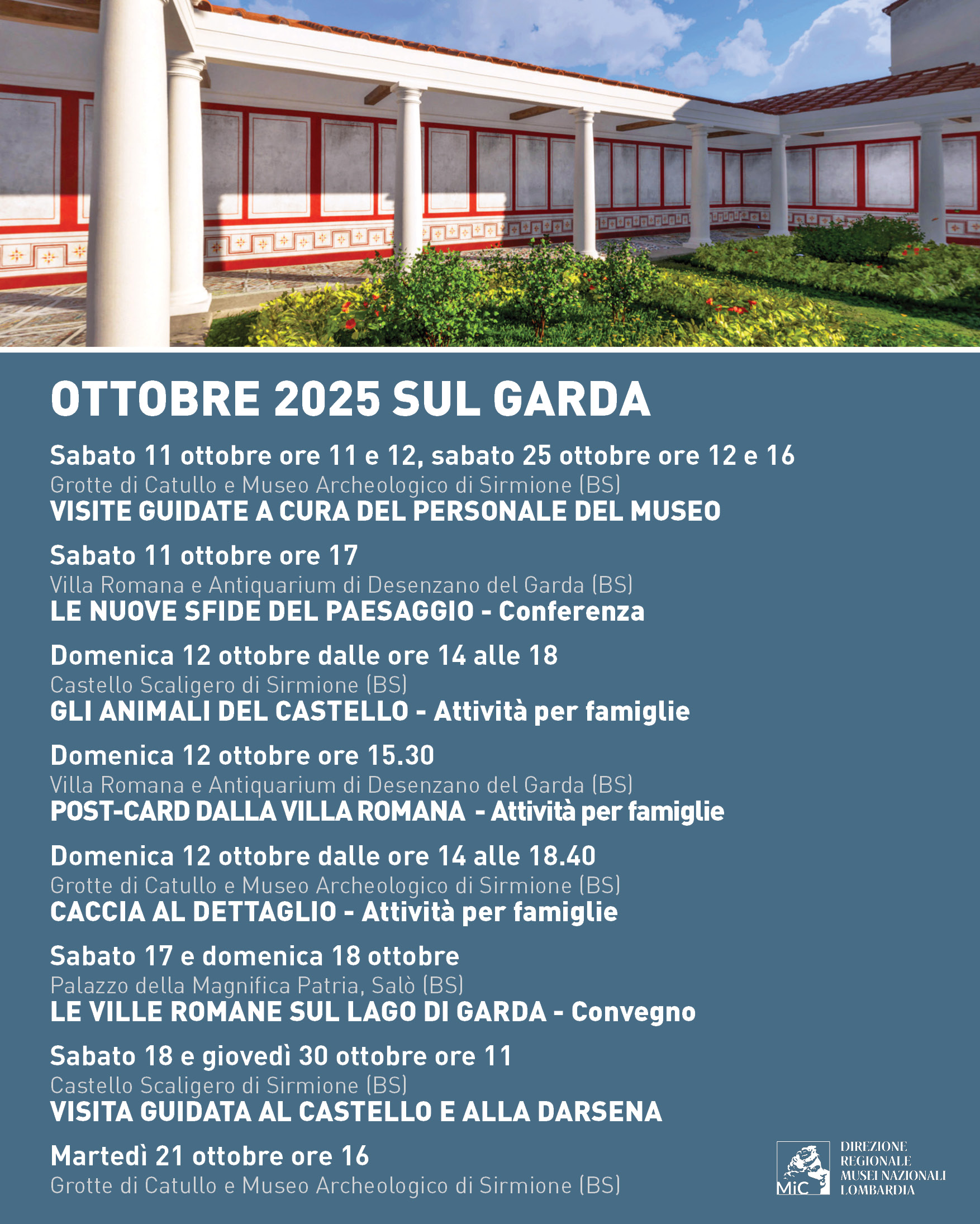 Il 17 ottobre il Palazzo della Magnifica Patria ospiterà un convegno che verterà sulle numerose testimonianze di edifici residenziali romani che il territorio del Garda conserva. Interverranno diversi esperti del settore. Il giorno seguente è prevista una visita guidata presso la Villa Romana di Desenzano del Garda e presso le Grotte di Catullo. Un’occasione per appassionati e addetti ai lavori per approfondire aspetti storici, archeologici e architettonici di queste straordinarie vestigia. Prenotazione obbligatoria via mail (drm-lom.villadesenzano@cultura.gov.it) oppure via telefono 030 9143547 (biglietteria).
