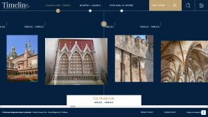 I nostri siti consentono un viaggio nella storia dell’uomo e delle sue espressioni artistiche che prende avvio dalle incisioni rupestri della Valle Camonica, per passare alla romanizzazione, alle invasioni barbariche, all’epoca longobarda, al Medioevo, allo splendore del Rinascimento e via via sino ai primi decenni del Novecento, con la Cappella Espiatoria di Monza”, continua Emanuela Daffra. Che aggiunge: “È uno strumento di conoscenza semplice e forse desueto, ma efficace, per il quale abbiamo voluto un’interfaccia grafica intuitiva e contemporanea. Essa permette all’utente di accedere subito a un primo livello di informazioni importanti quali per esempio titolo, data, autore, periodo di appartenenza. Se il “viaggiatore nel tempo” desidera addentrarsi in un periodo specifico può utilizzare lo strumento “Time Zoom” e scoprire, per esempio, che Leonardo finì di realizzare l’Ultima Cena nell’anno in cui i francesi, sotto il comando di Gian Giacomo Trivulzio, conquistarono Milano e costrinsero Ludovico il Moro alla fuga.”