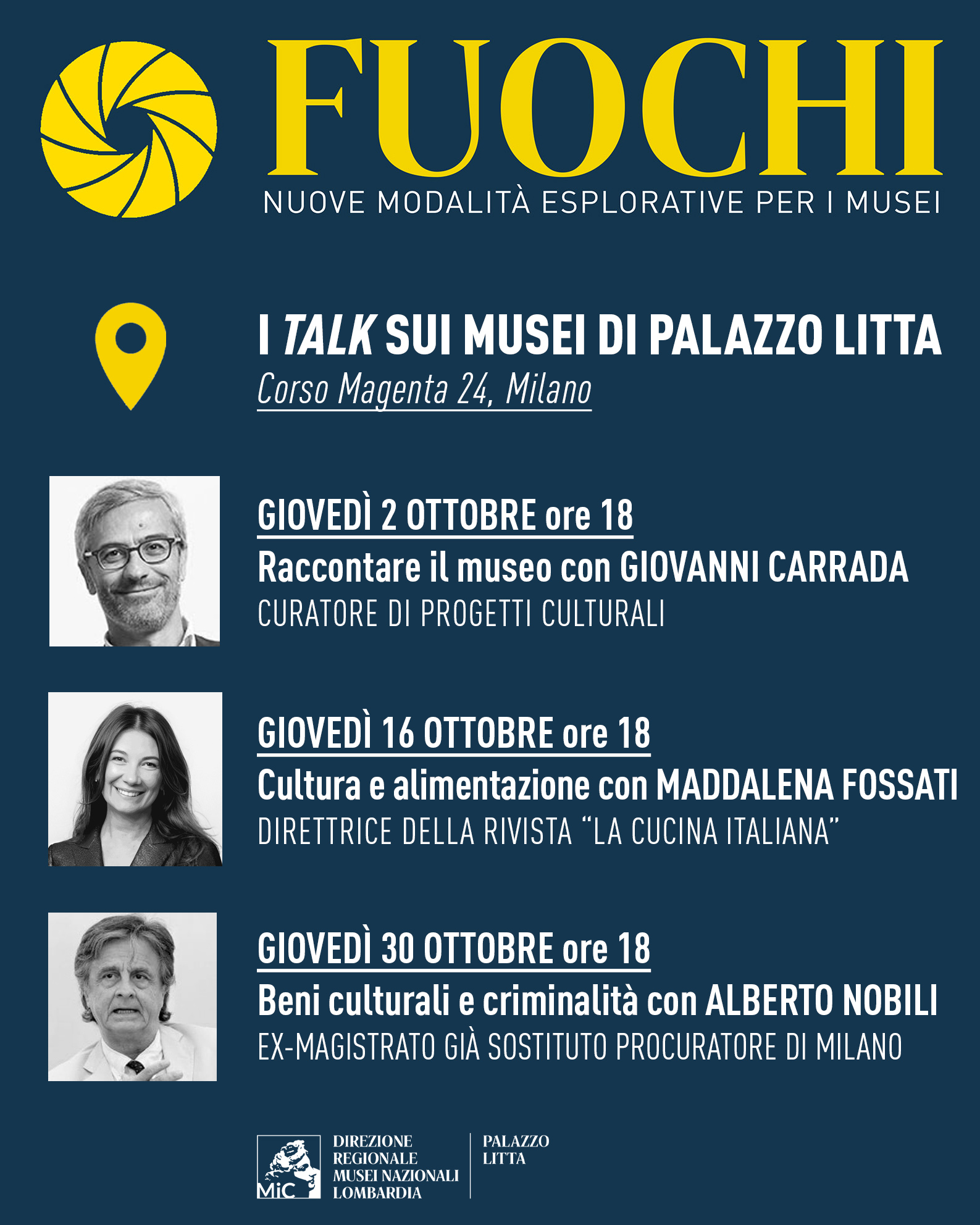 Palazzo Litta apre nuovamente al pubblico le sue sale con “Fuochi”, una serie di talk dedicati ai musei, pensati per approfondire temi culturali in maniera leggera e coinvolgente. Sono tre gli incontri che compongono questo ciclo: 2, 16 e 30 ottobre, sempre di giovedì, alle ore 18, presso la Sala Azzurra al primo piano di Palazzo Litta in corso Magenta 24 a Milano. Un viaggio alla scoperta del patrimonio culturale della regione custodito nei musei della Direzione regionale Musei nazionali Lombardia, dei capolavori d’arte e del loro significato.